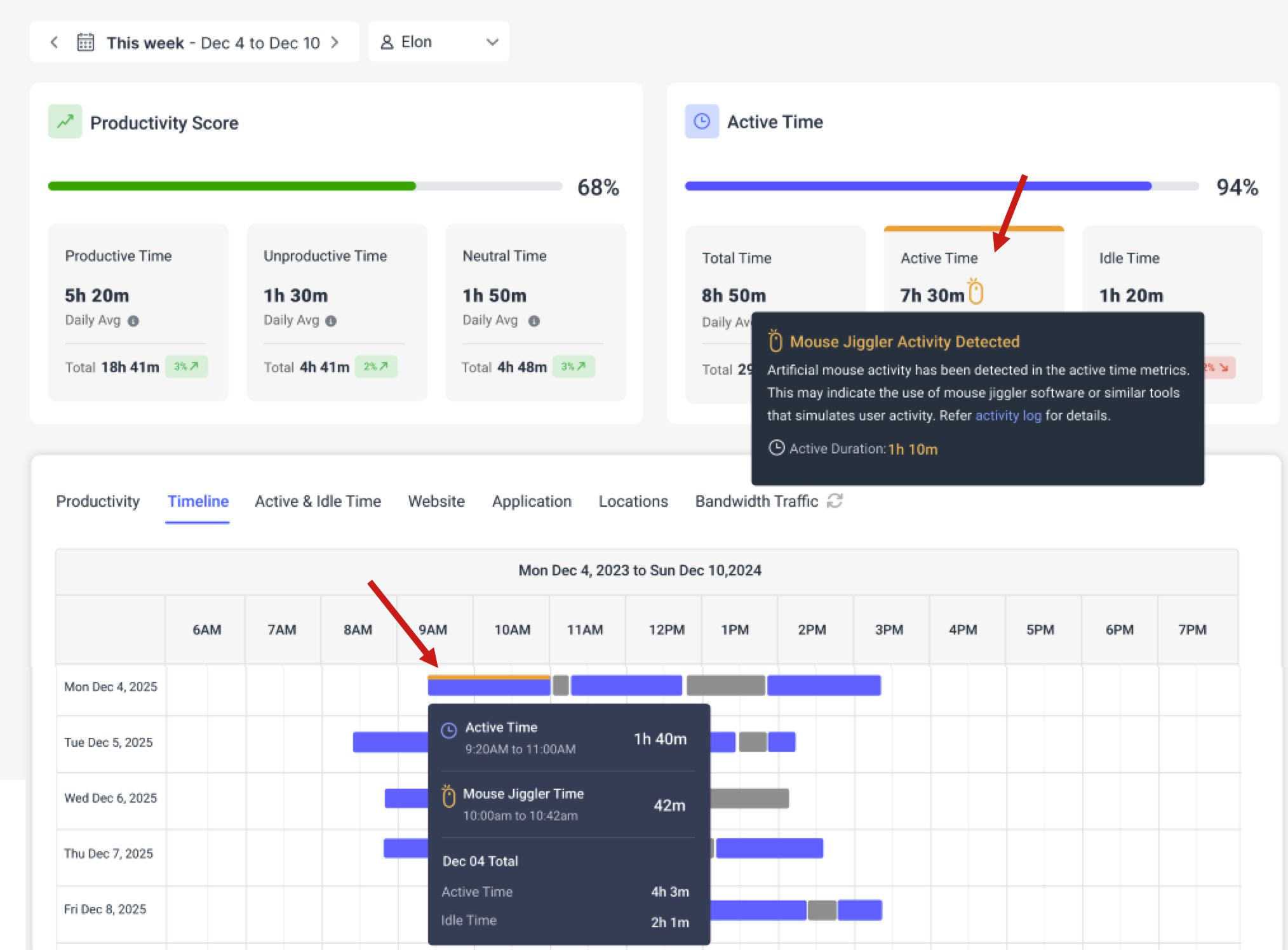 When enabled, CurrentWare analyzes mouse movement patterns and flags behavior that differs from natural human input, such as repetitive or continuous movement over long periods. Detected activity is recorded in the Timeline view.