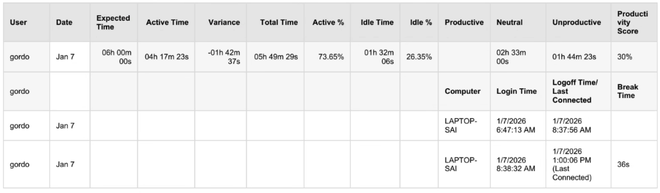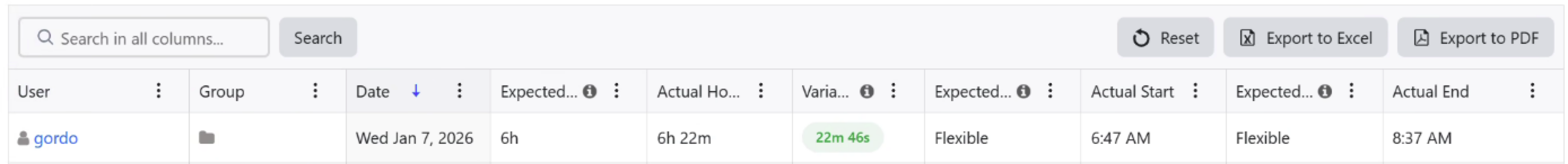 Schedule Adherence enables managers to monitor how closely employees follow assigned work schedules, helping identify late starts, early finishes, and attendance patterns.