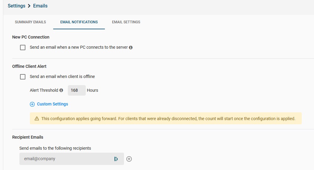 The Offline Client Alert feature allows administrators to receive automated email notifications when a client remains disconnected from the server for a specified period. This ensures you stay informed about potential connectivity issues or hardware downtime without having to monitor the dashboard manually.