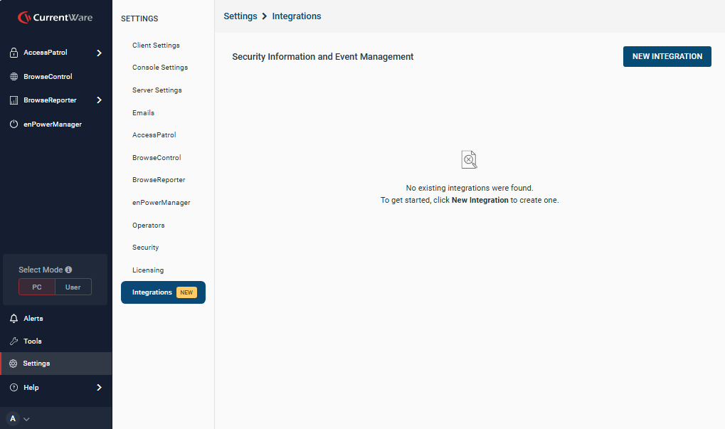 The SIEM integration is available in the CurrentWare Console under Settings > Integrations.