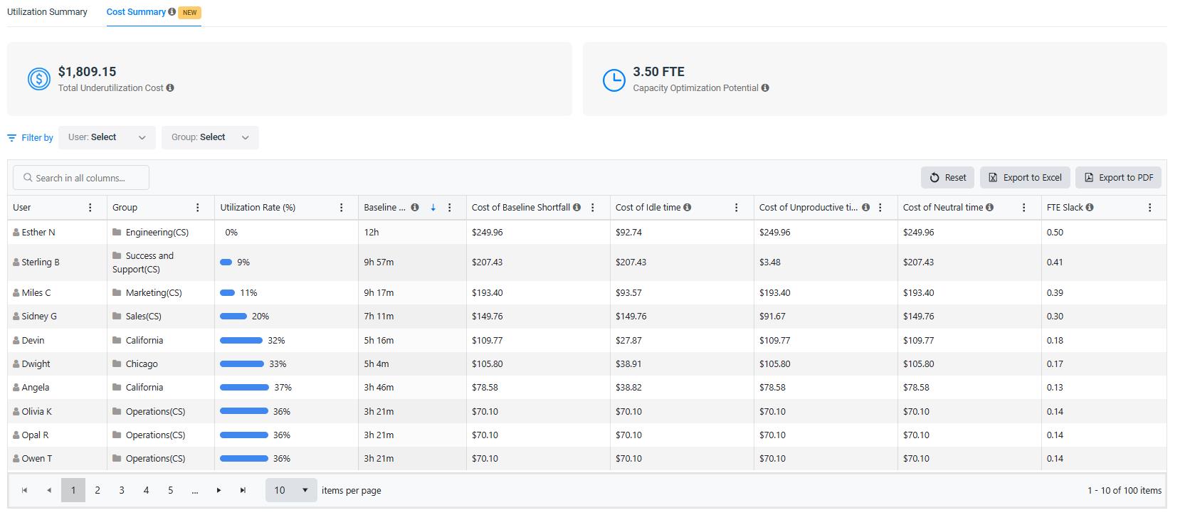 The Cost Summary tab within the Utilization dashboard uses the salary data to calculate and display the financial impact of lost productivity. Key metrics include: